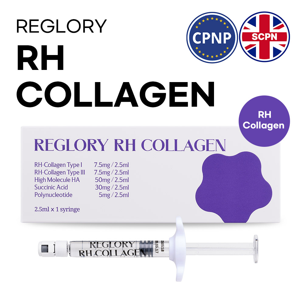 REGLORY RH COLLAGEN es un revitalizante cutáneo inyectable de última generación, formulado para restaurar, rejuvenecer y regenerar drásticamente la piel envejecida. Desarrollado mediante biotecnología recombinante de vanguardia, presenta una potente sinergia de colágeno RH de tipos I y III idéntico al humano, ácido hialurónico de alto peso molecular, ácido succínico y polinucleótidos en una solución de 2,5 ml.